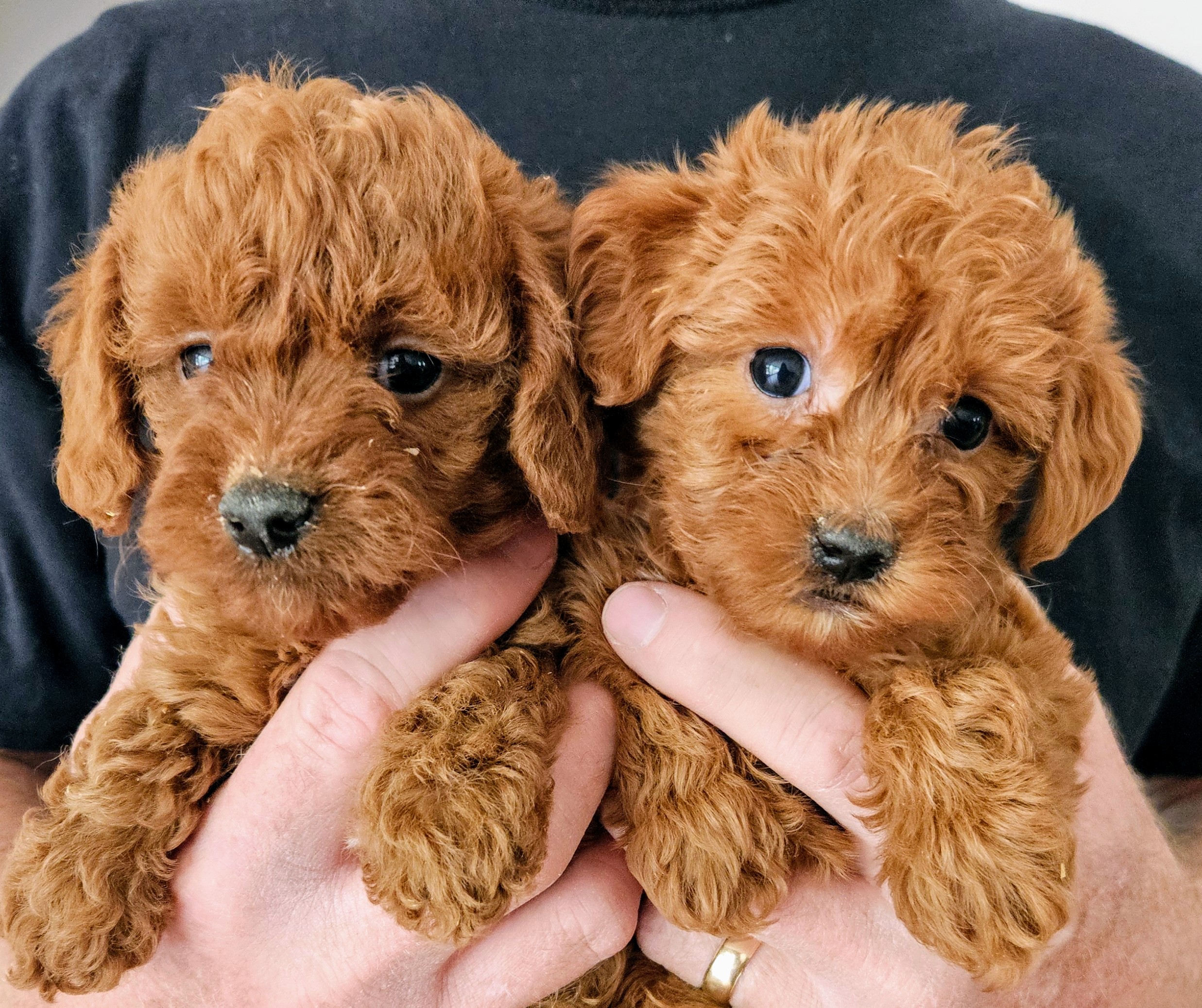 Our Mini Goldendoodle "Glory" (10lbs) has been matched up with health-screened little AKC Toy Poodle "Moki" (10lbs) to produce a healthy litter of mini F1b Goldendoodle puppies. These pups will be ready for their new homes the beginning of May. The pups are sure to bring smiles to many happy families. We anticipate a full grown weight somewhere around 9-11 lbs.